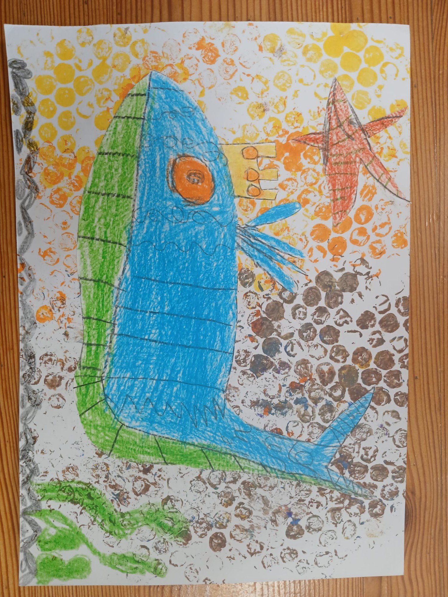 2. etaps- zīmēts un krāsots valis un jūras zvaigzne, vēlāk izgriezts un pielīmēts.