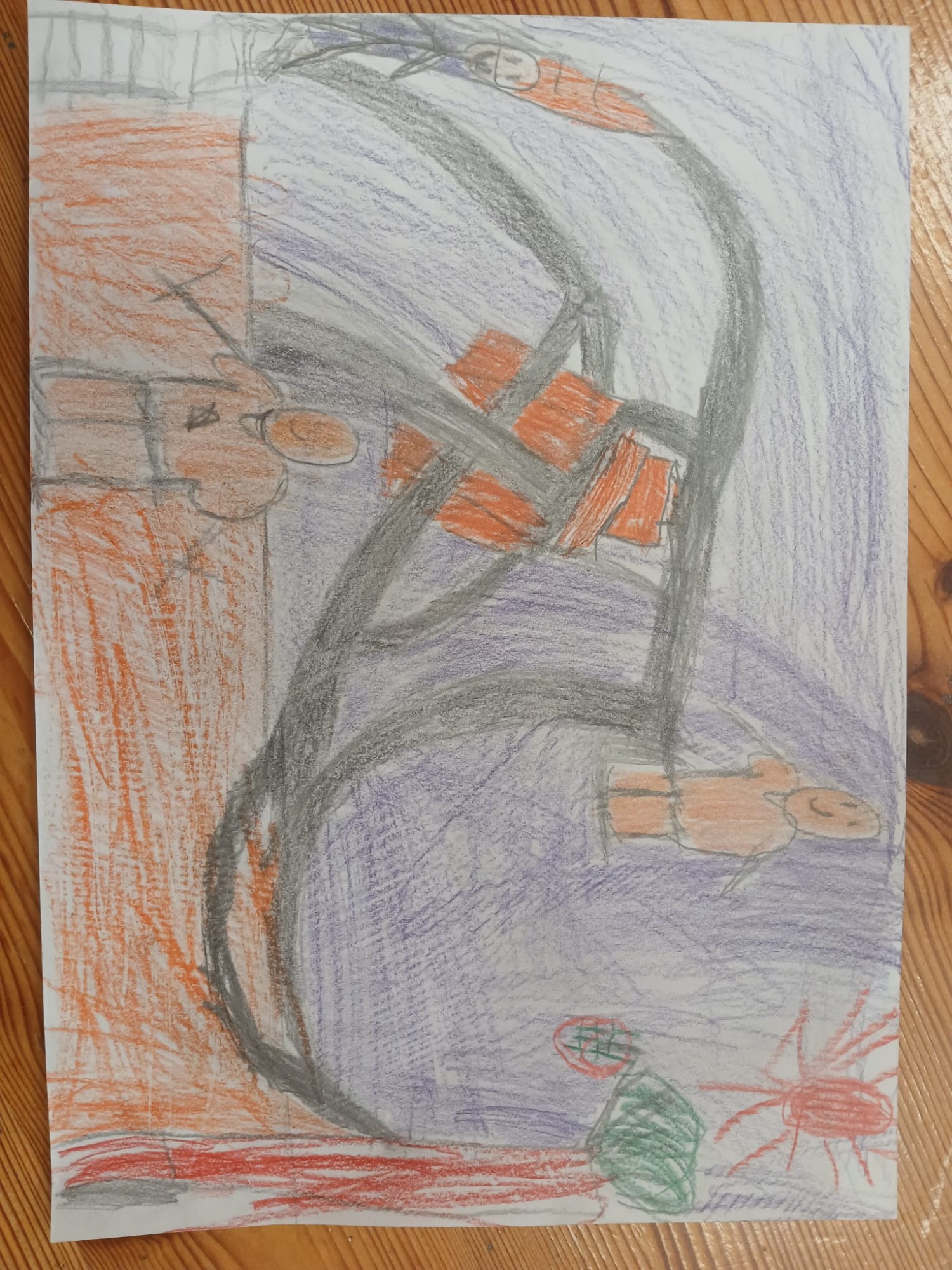 Zīmējums tapis ar krāsainajiem zīmuļiem.
