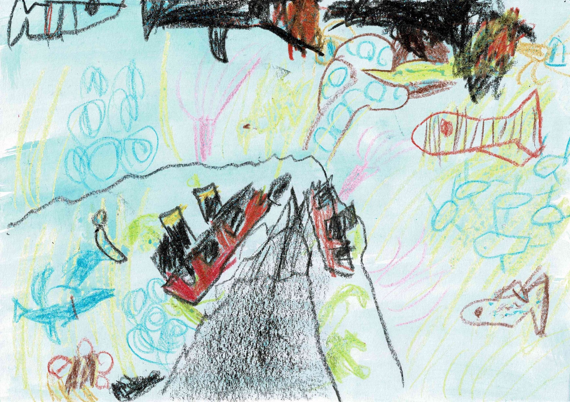 *Pēkšņi okeānā nodārd troksnis,kas nobaida visas zivis un tās noslēpjas aļģēs un koraļļos.Tur nogrima Titāniks,kurš bija uzskrējis uz aizberga un pārlūza uz divām pusēm.