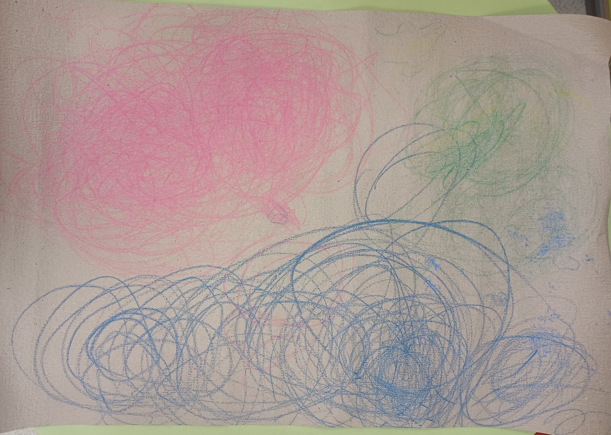 a2 formāta darbs, krītiņi, zilā krāsa simbolizē jūras ūdeni, rozā - saulrieta debesis
