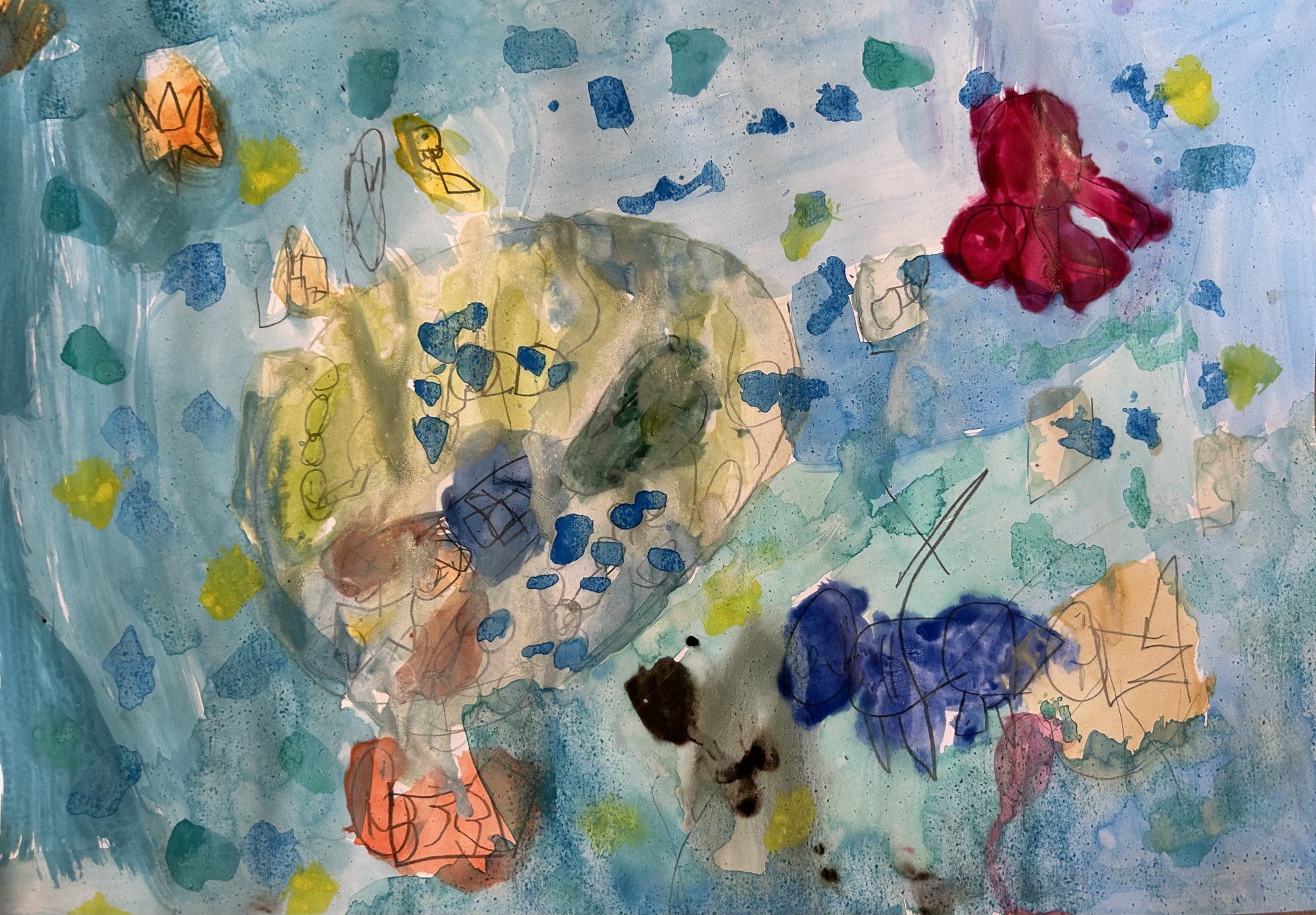 Zīmējumā attēloti akvalangisti un zemūdens iemītnieki. Darbs veidots, izmantojot krītiņus, flomāsterus un akvareļkrāsas.