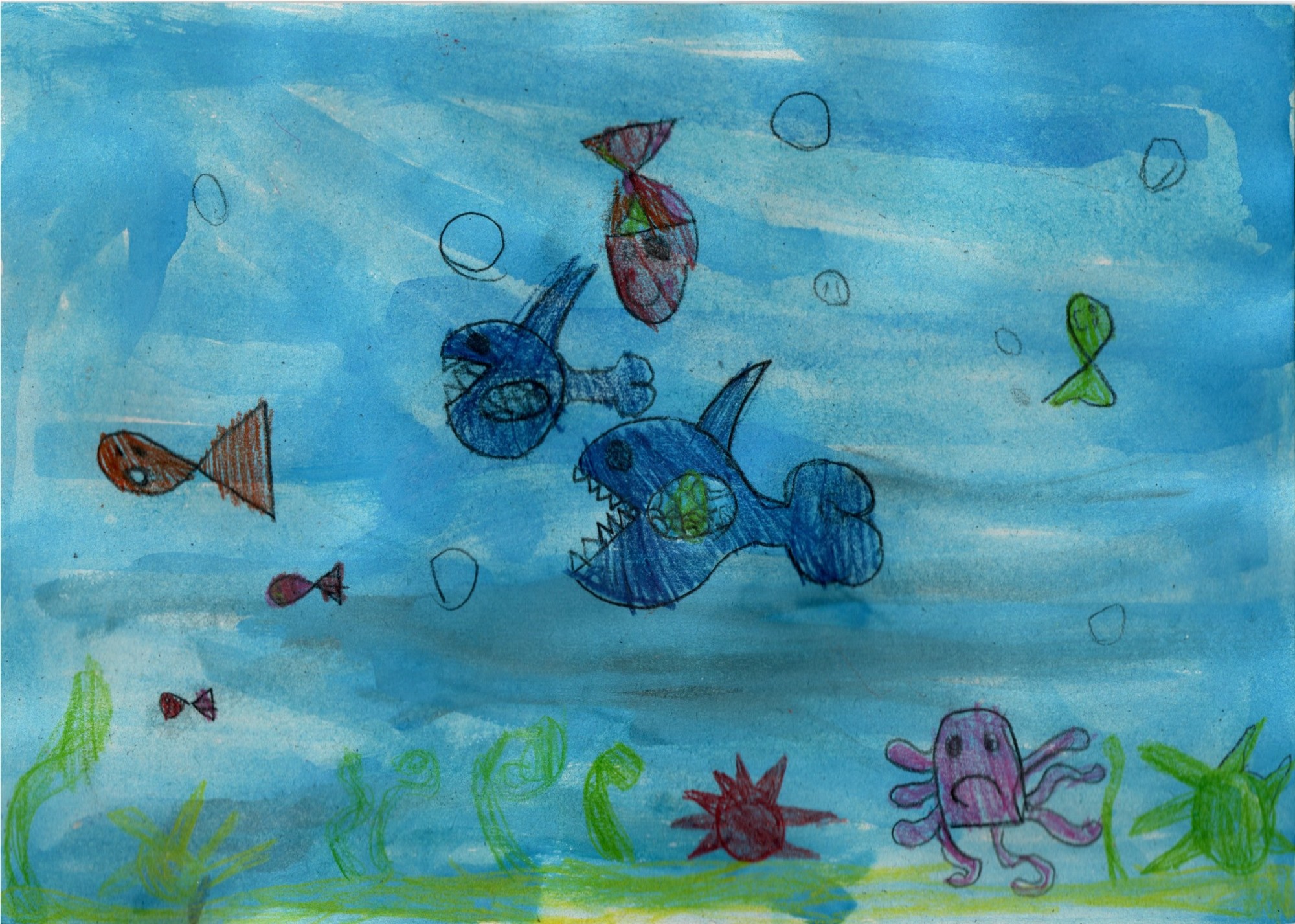 Ūdenī dzīvo daudz zivju. Citas ir draudzīgas, citas ne ļoti. Haizivs dzenas pakaļ zelta zivtiņām. Astoņkājis ir bēdīgs, jo viņam nav draugu.