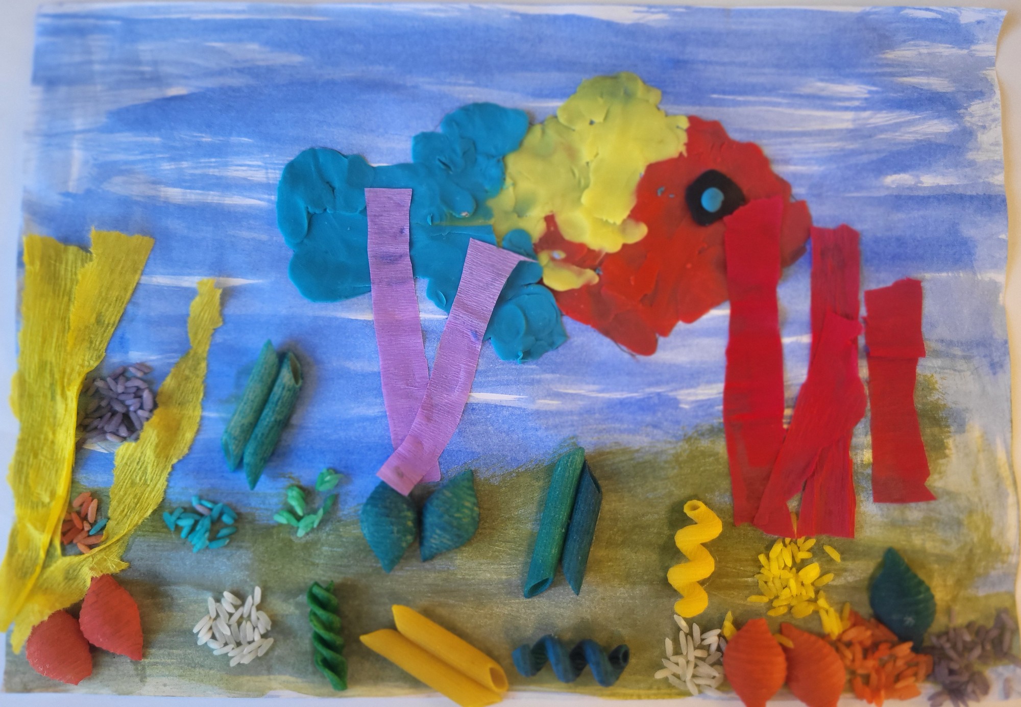 Zīmējumā attēlots zivs ceļojums pa krāšņo ūdens pasauli. Ūdens ir mājas daudz iemītniekiem un augiem.