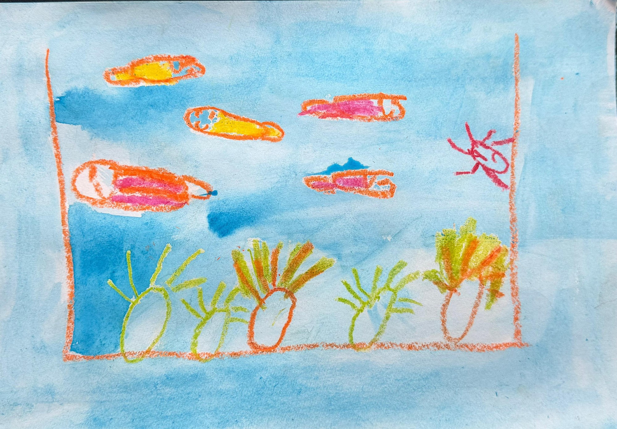 Zīmējumā attēlots nogrimis akvārijs, kas kļuvis par daļu no zemūdens pasaules. Tajā peld zivis un aug ūdensaugi, taču akvārija sienas atgādina par cilvēku atstātajiem priekšmetiem ūdenī. Darbs rosina domāt par to, ka izmestās lietas var kļūt par slazdu jūras iemītniekiem. Veidots jauktā tehnikā – ar krītiņiem un akvareli.