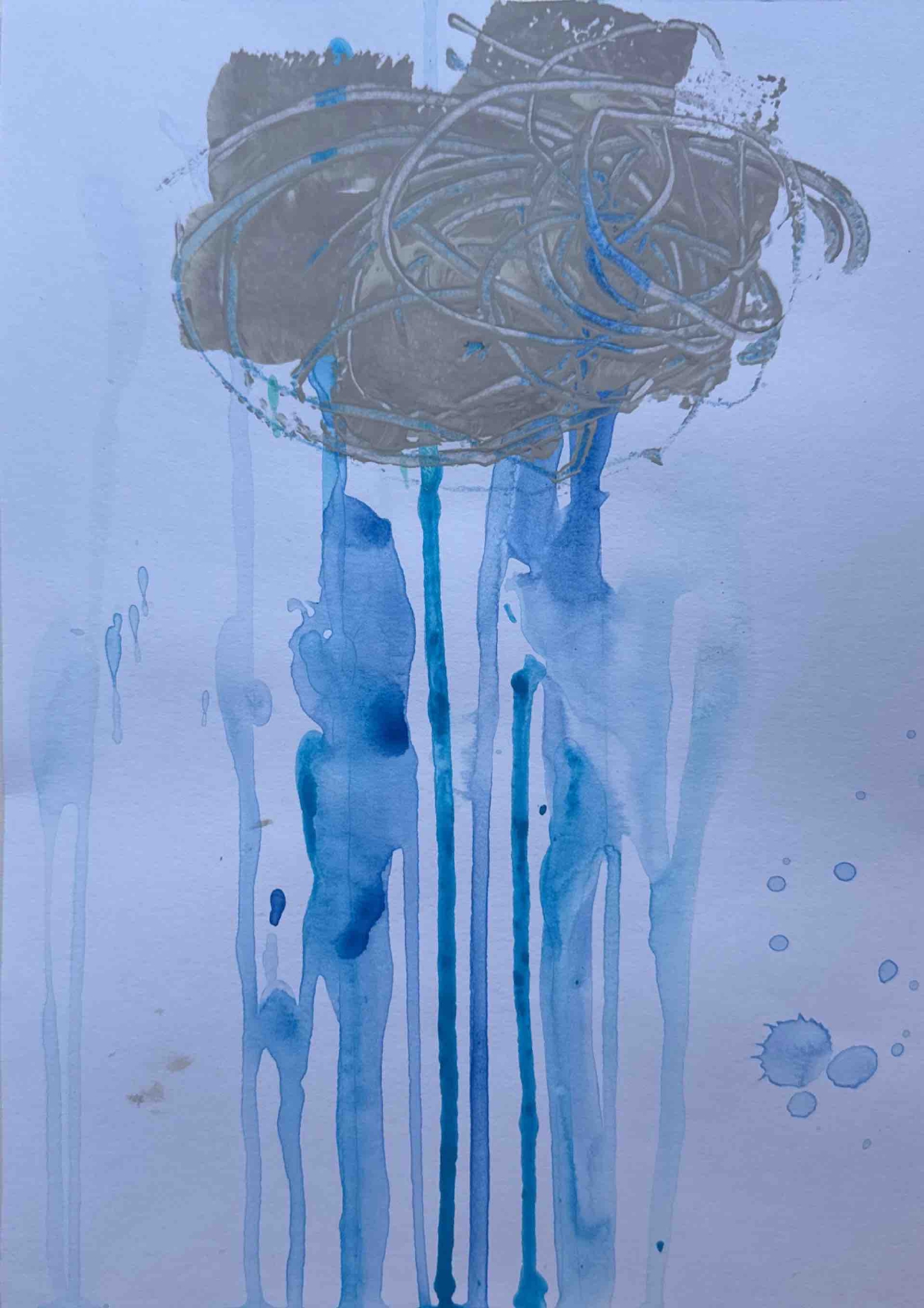 Lietus attēlots, ar pipeti pilinot iekrāsotu ūdeni uz papīra, ļaujot tam dabiski notecēt un radīt plūstošas, brīvas formas.