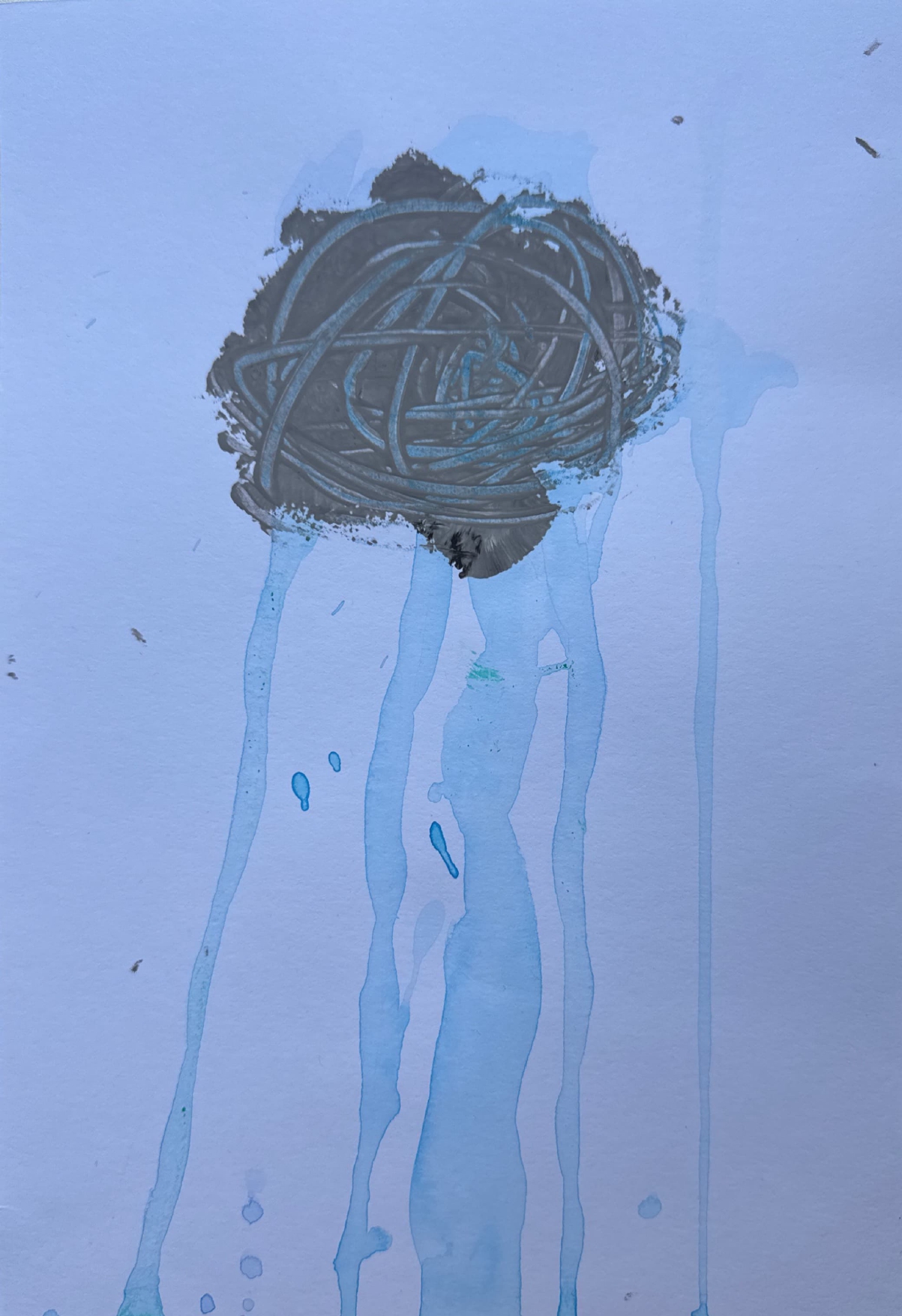 Lietus attēlots, ar pipeti pilinot iekrāsotu ūdeni uz papīra, ļaujot tam dabiski notecēt un radīt plūstošas, brīvas formas.