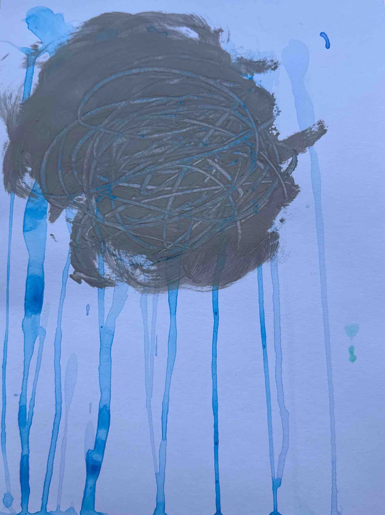 Lietus attēlots, ar pipeti pilinot iekrāsotu ūdeni uz papīra, ļaujot tam dabiski notecēt un radīt plūstošas, brīvas formas.
