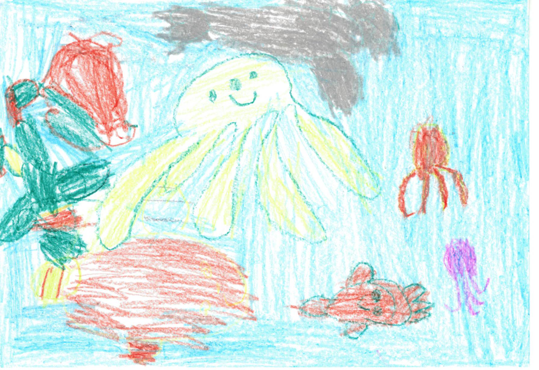 Zīmējumā attēlots astoņkājis, zivis, medūzas, ronis.