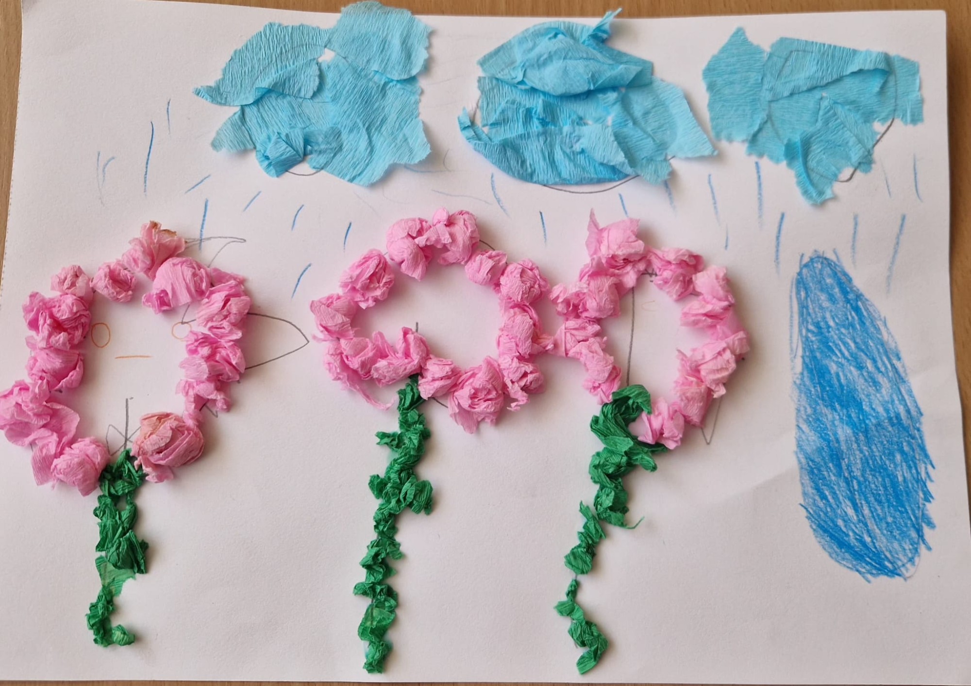 Ar šo attēlojumu bērni parāda izpratni, ka bez ūdens ziedi un citi augi nevarētu augt un attīstīties. Tas papildina kopējo darba ideju par ūdeni kā dzīvības pamatu visām dzīvajām būtnēm.
