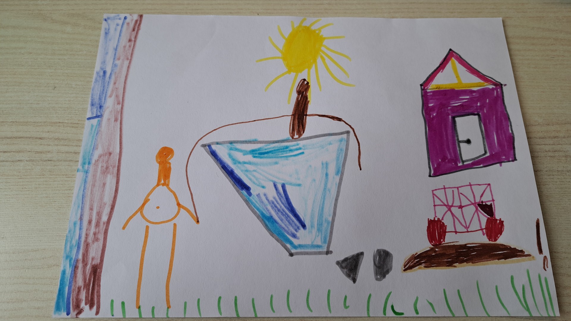 Bērns palīdz iekāpt otram bērnam baseinā, lai kopīgi var priecāties. Ir uzbūvēta ūdens aizsardzības siena, lai paši var regulēt, cik ūdeni vajag.