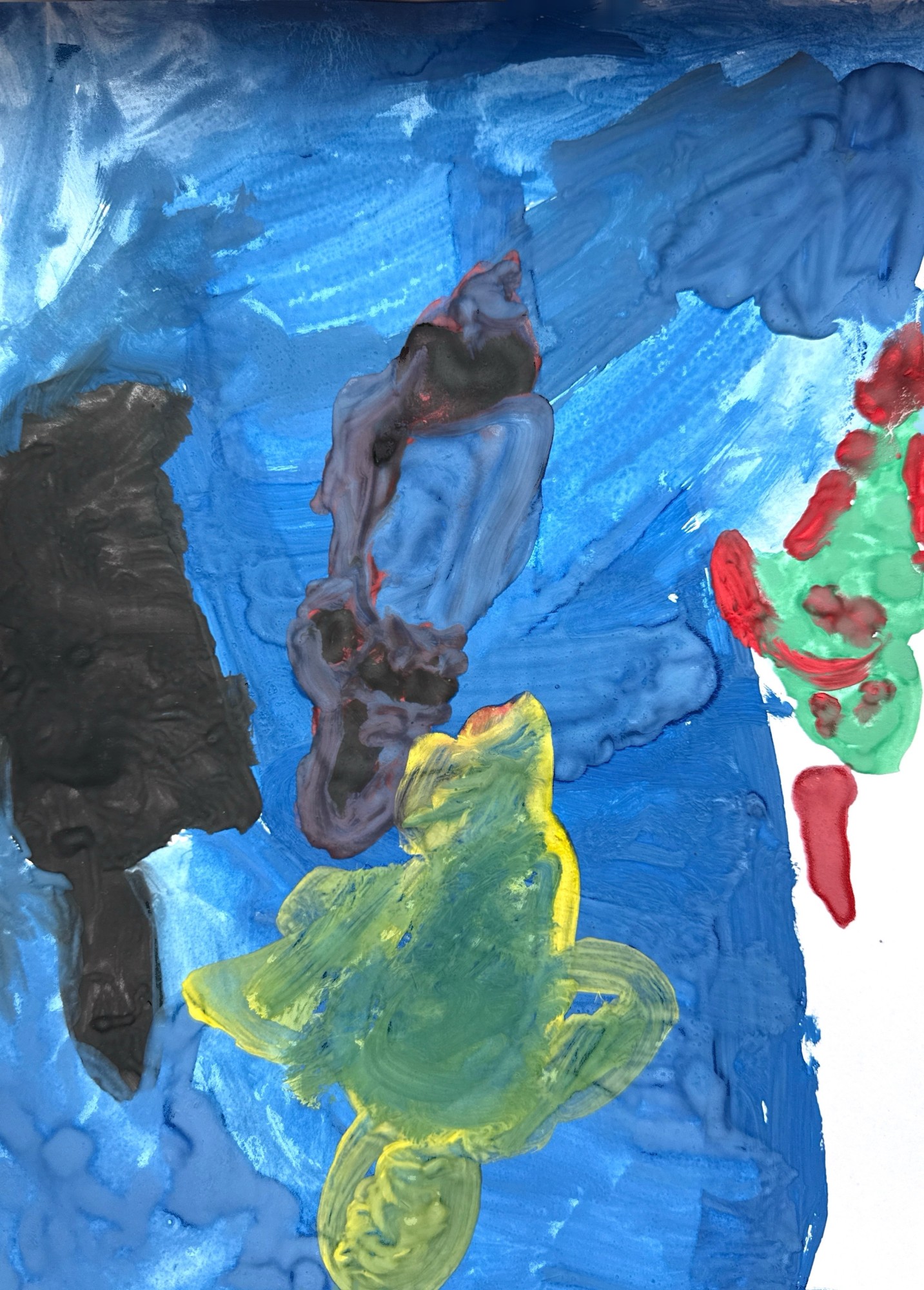 Zīmējumā attēlota zemūdens pasaule ar krāsainiem jūras iemītniekiem. Zilais fons simbolizē ūdeni, kurā peld dažādas formas un krāsu radības
