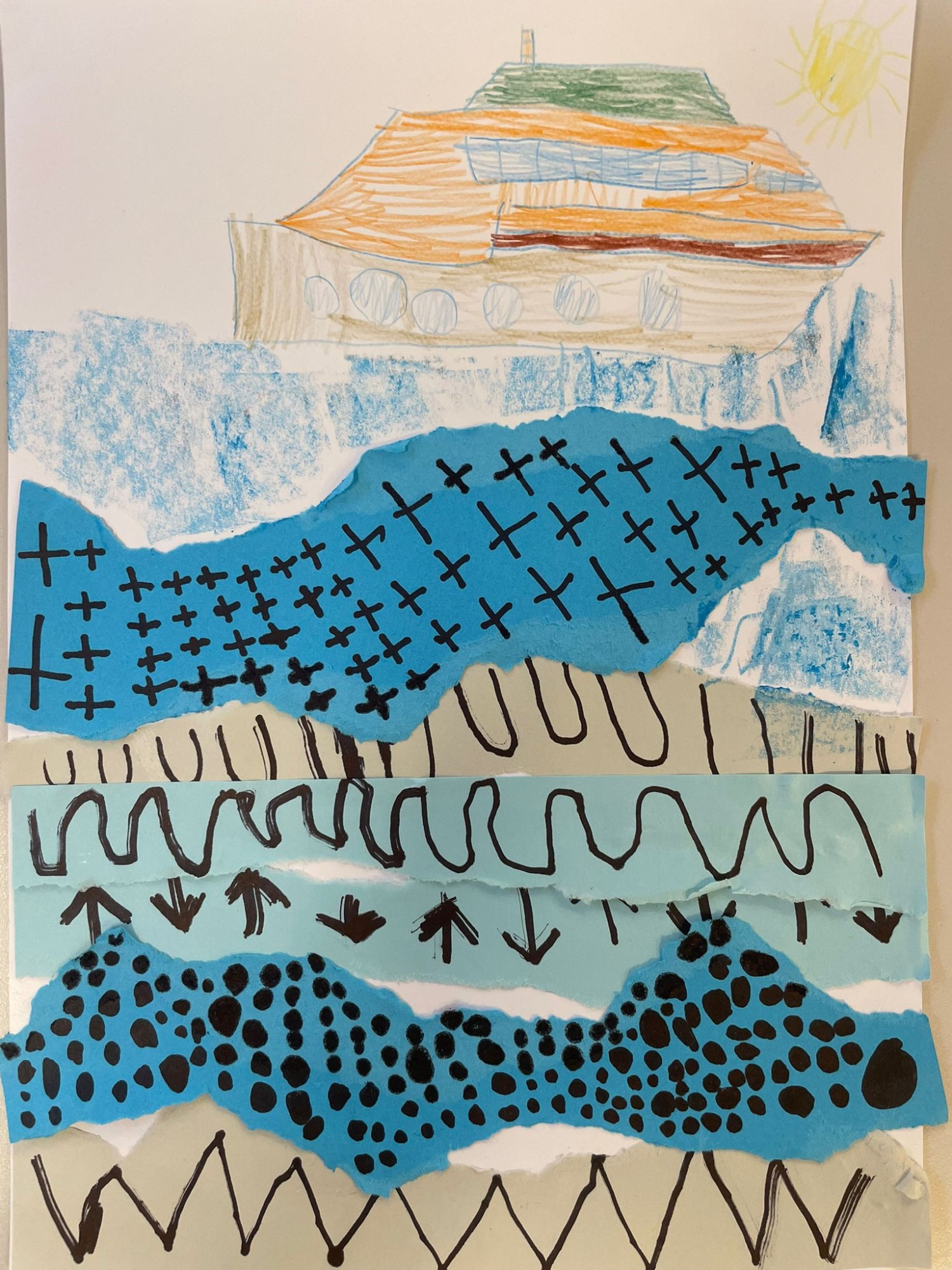 Kruīza kuģis jūras viļņos. Viļņi veidoti no plēstām papīra sloksnītēm, dekorēti ar dažādiem rakstiem.