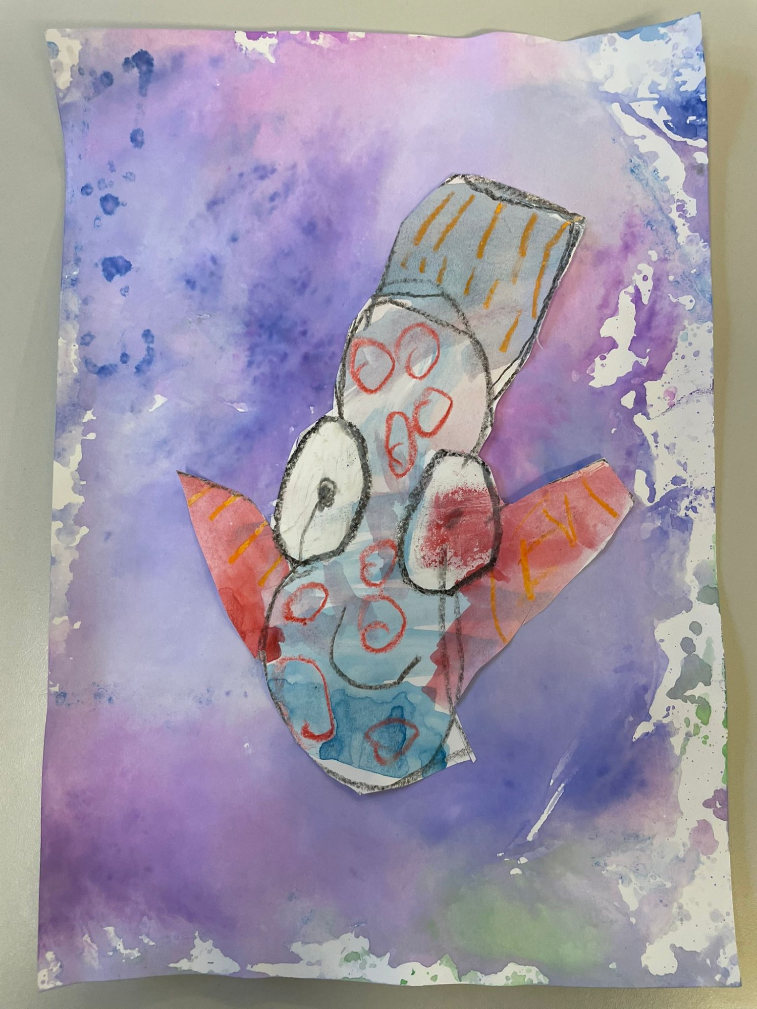 Zīmējumā redzama zivs, kas zīmēta ar krītiņiem un krāsota ar akvareļu krāsām. Zivs peld okeānā, kas radīts ar krāsu nospiedumu, izmantojot flomasterus, foliju un ūdeni.