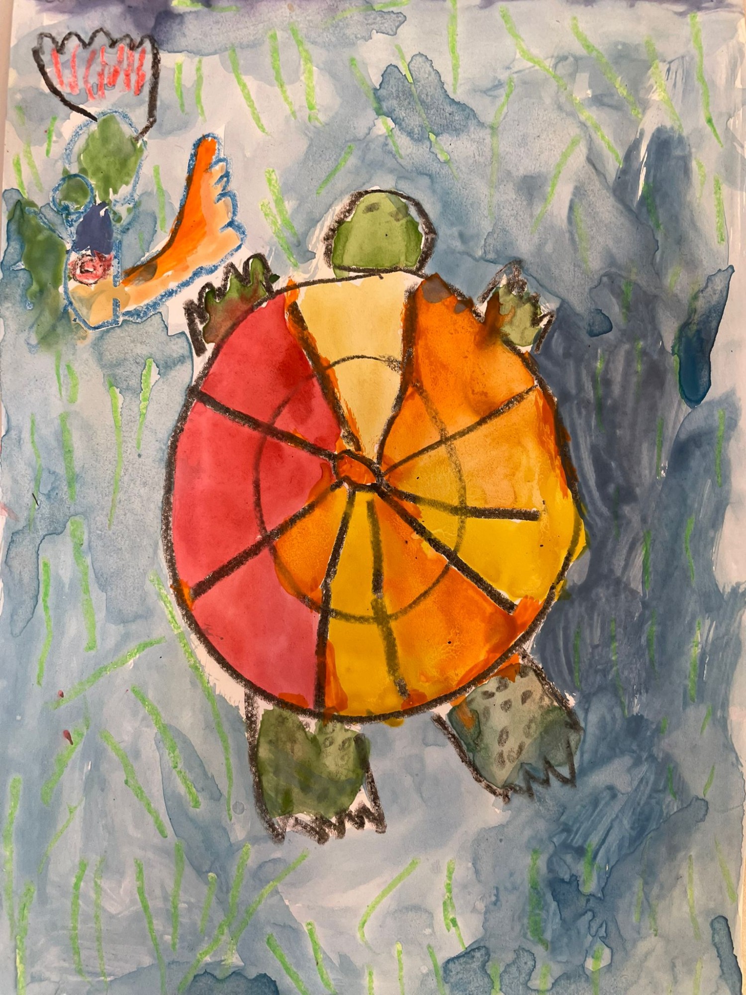 Zīmējumā attēlots bruņurupucis un zivs, kuri spēlējās ūdenī. Zīmējums gleznots, izmantojot krītiņus un akvareļu krāsas.