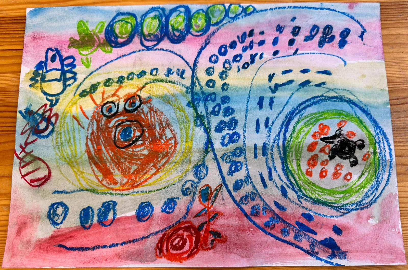 Zīmējumā redzamas zivtiņas, bruņurupucīši un ūdens burbulīši.