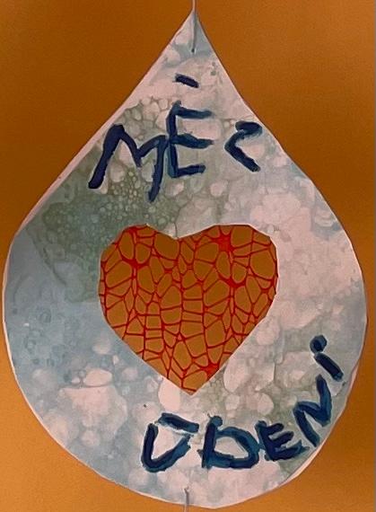 Divas A4 lapas tika krāsotas ar krāsainiem (zilu un zaļu) ziepju burbuļiem. Tad tika izgriezta ūdens piles forma ar sirsniņu vidū. Sirsniņas aizmugurē tika pielīmēts sarkans tīkliņveida materiāls. Abas ūdens piles tika salīmētas kopā un uzrakstīts teksts.