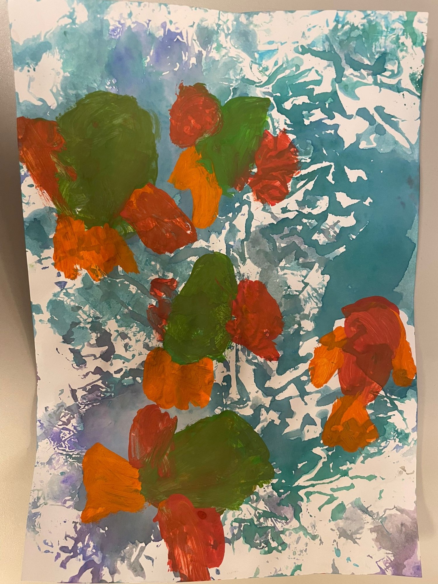 Zīmējumā redzama jūra, kas gleznota, veidojot nospiedumu, izmantojot flomasterus, foliju un ūdeni. Jūrā peld zivis, kas gleznotas, izmantojot guaša krāsas.