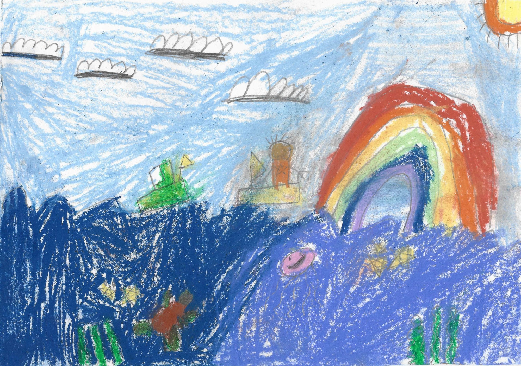 Dzīve ūdenī ir ļoti jautra! Tehnika: pasteļkrītiņi un zīmuļi. A4