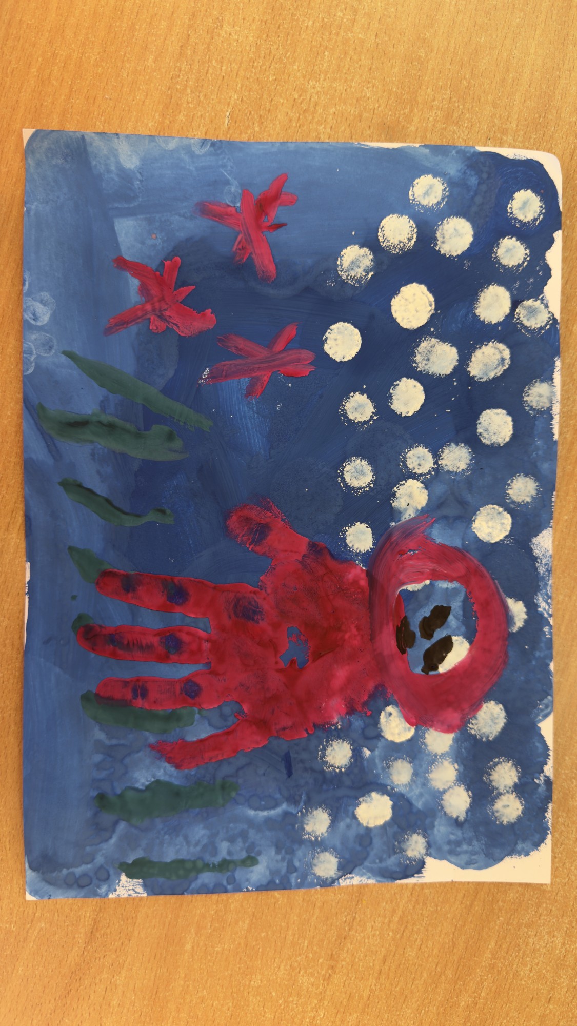 Zīmēts ar guašu krāsām, izmantotas otas, švammes, pirkstiņi, plaukstas nospiedumi! Okeāna iemītniekiem arī, lai dzīvotu vajag ūdeni!