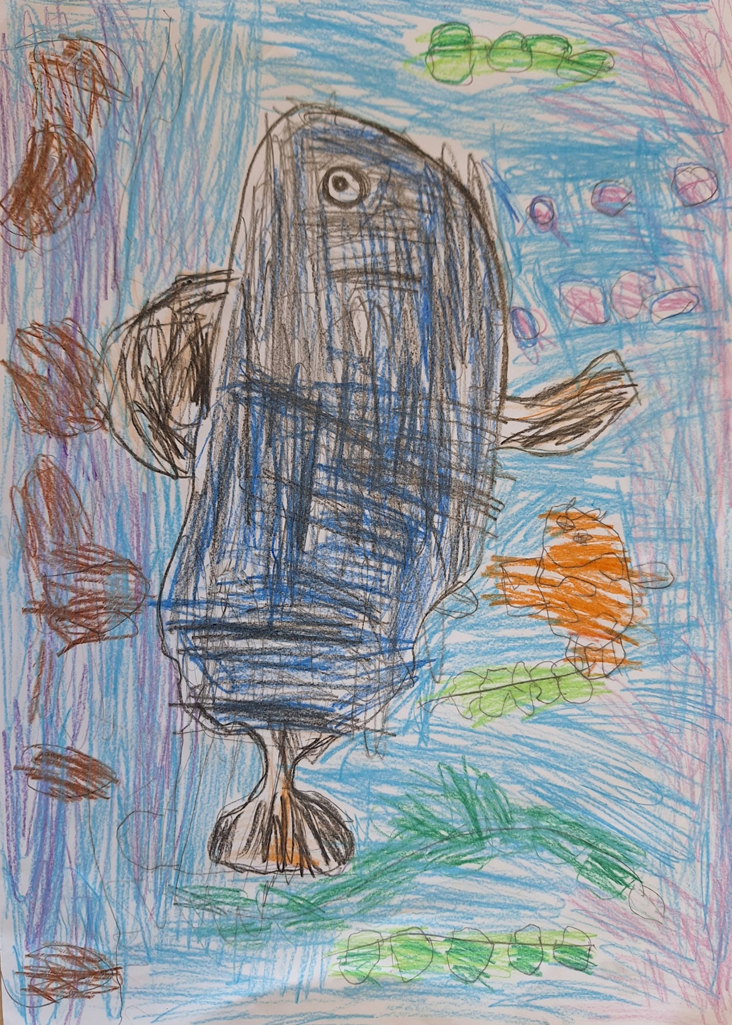 Lielā zivs ir stipra un viņa sargā savu mazo, oranžo draudziņu. Kādā saulainā dienā lielā zivs teica mazajai zivtiņai: "Nāc, mēs peldēsim sacīkstes līdz zaļajām zālēm!" Mazā zivtiņa piekrita un jautri pūšot burbuļus, abas metās ūdenī. Bez ūdens zivtiņas nevarētu satikties un draudzēties.