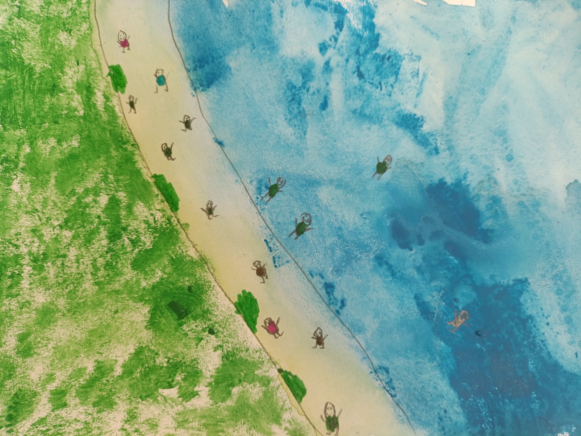 Šajā zīmējumā ir jūra un zilais ūdens. Cilvēki atpūšas. Bērni priecīgi spēlējas smiltīs pie ūdens. Ūdens ir svarīgs, jo tas dod prieku un padara vasaru jautru.