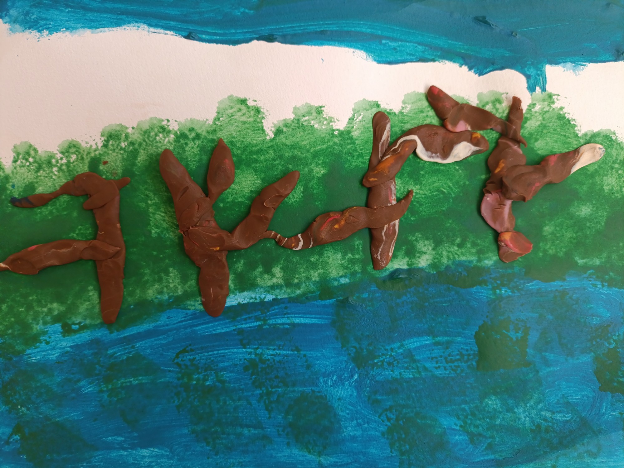 Šajā zīmējumā ir koki un ūdens. Ūdens ir ļoti svarīgs, jo tas palīdz kokiem augt un būt stipriem.