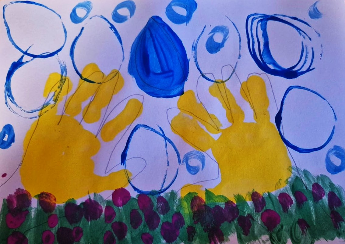 Ūdens burbuļi un krāsainas pēdas rāda jautru rotaļāšanos pie ūdens.