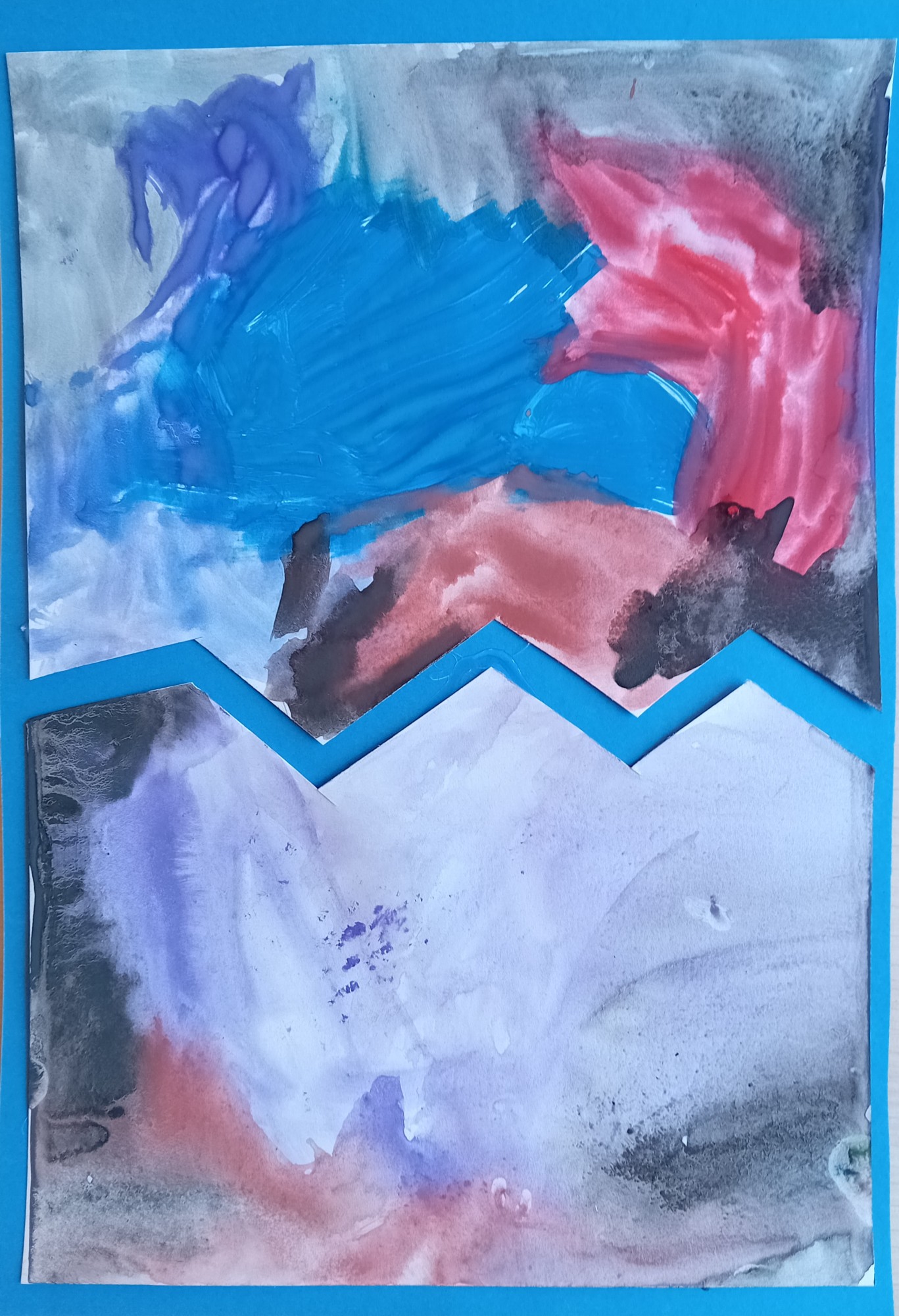 Zīmējuma vienā pusē attēlota pelēcīga pilsēta miglā,otrā pusē attēlotas zivis dīķī.