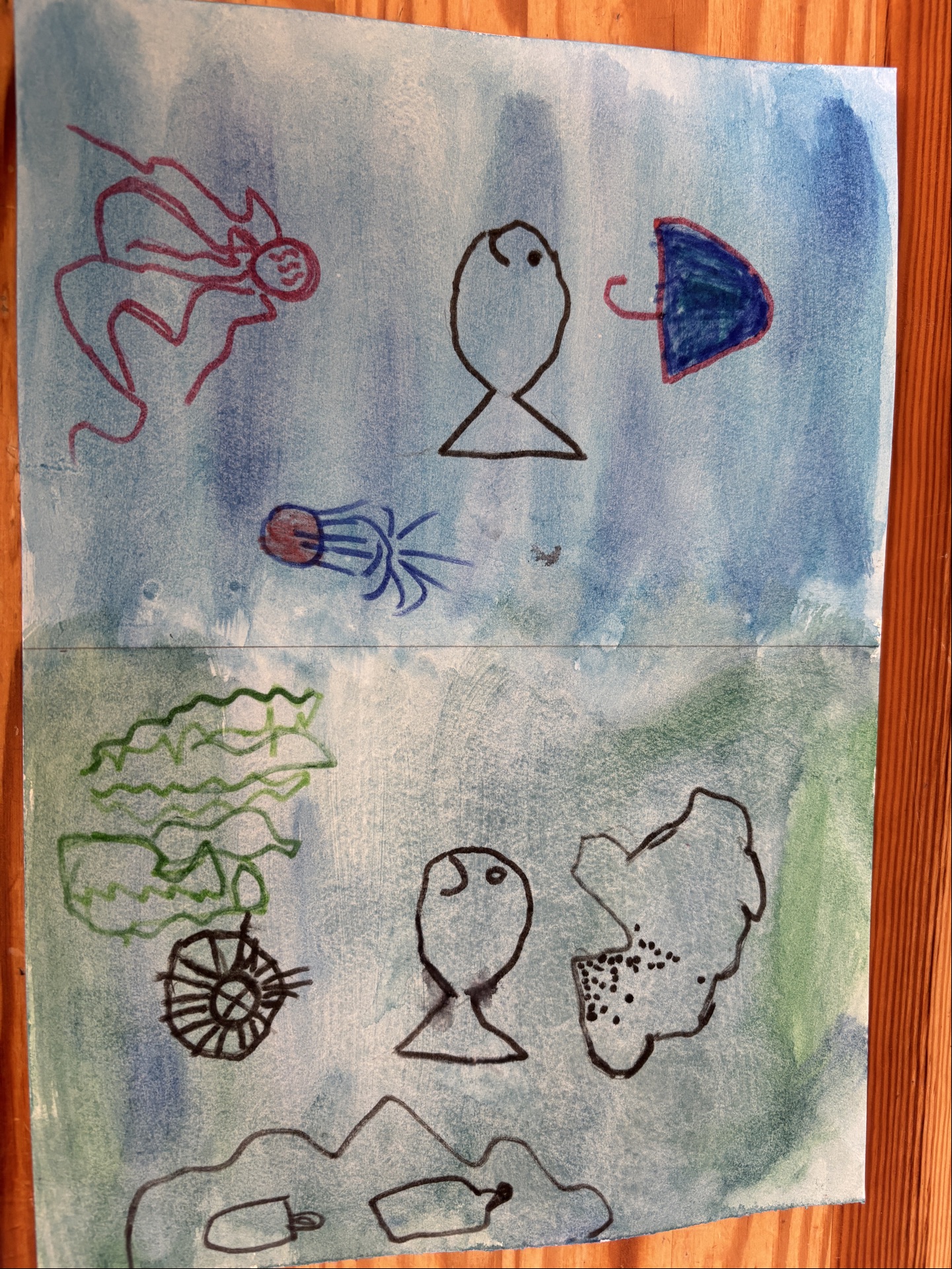 Zīmējumā attēlota jūras pasaule. Tajā redzamas dažādas jūras radības – zivis, medūza un citi jūras organismi. Zilais fons bērniem simbolizē tīru ūdeni. Savukārt, lietussargs un strūklaka atgādina vasaru un lietu. Kurš arī tiek uzskatīts par tīru ūdeni.