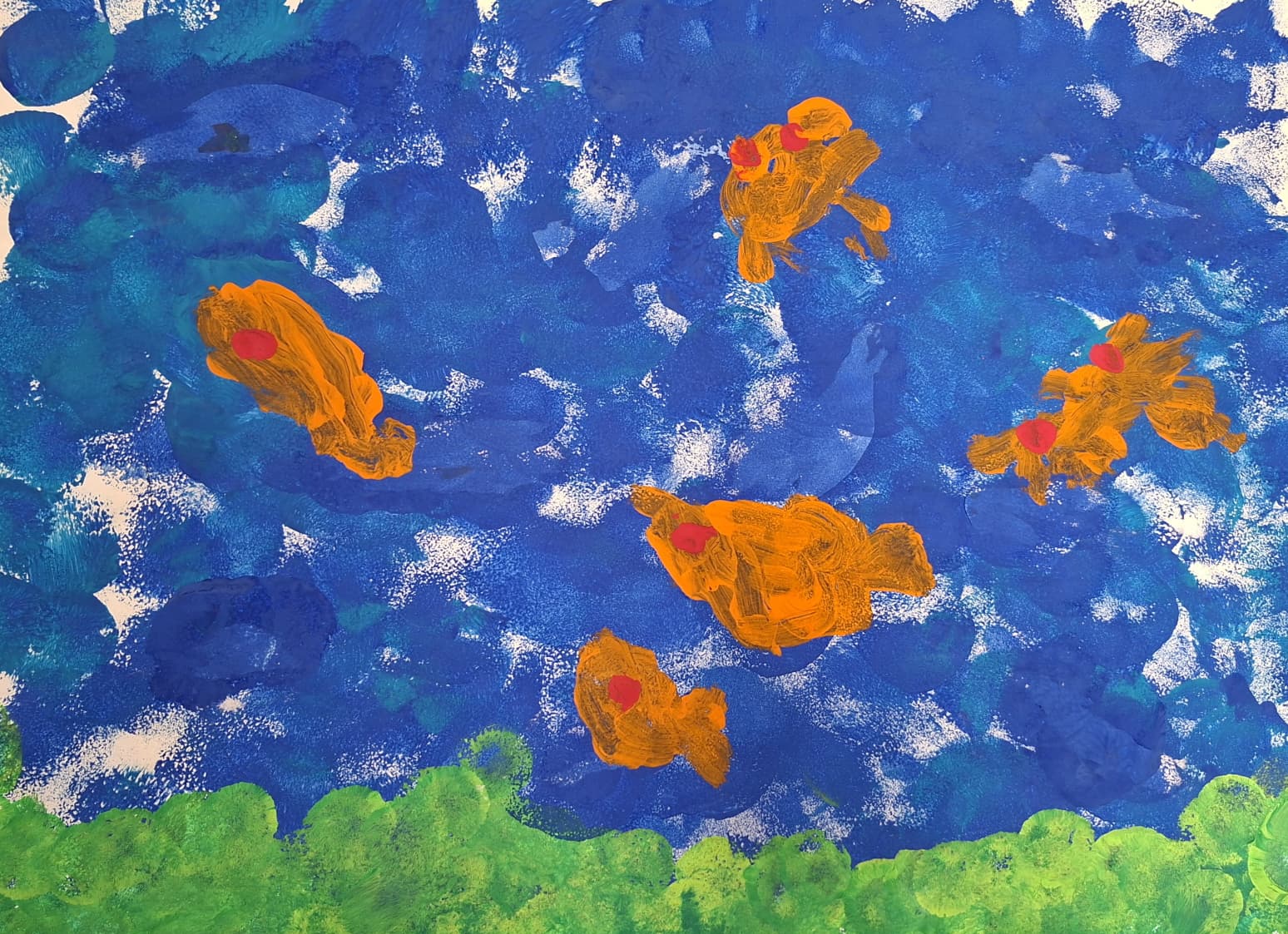 Ar spiedogu palīdzību bērni izveidoja zīmējuma fonu, ar otiņām un gauša krāsām zīmēja zivtiņas un krabišus, kuriem ir nepieciešams ūdens.
