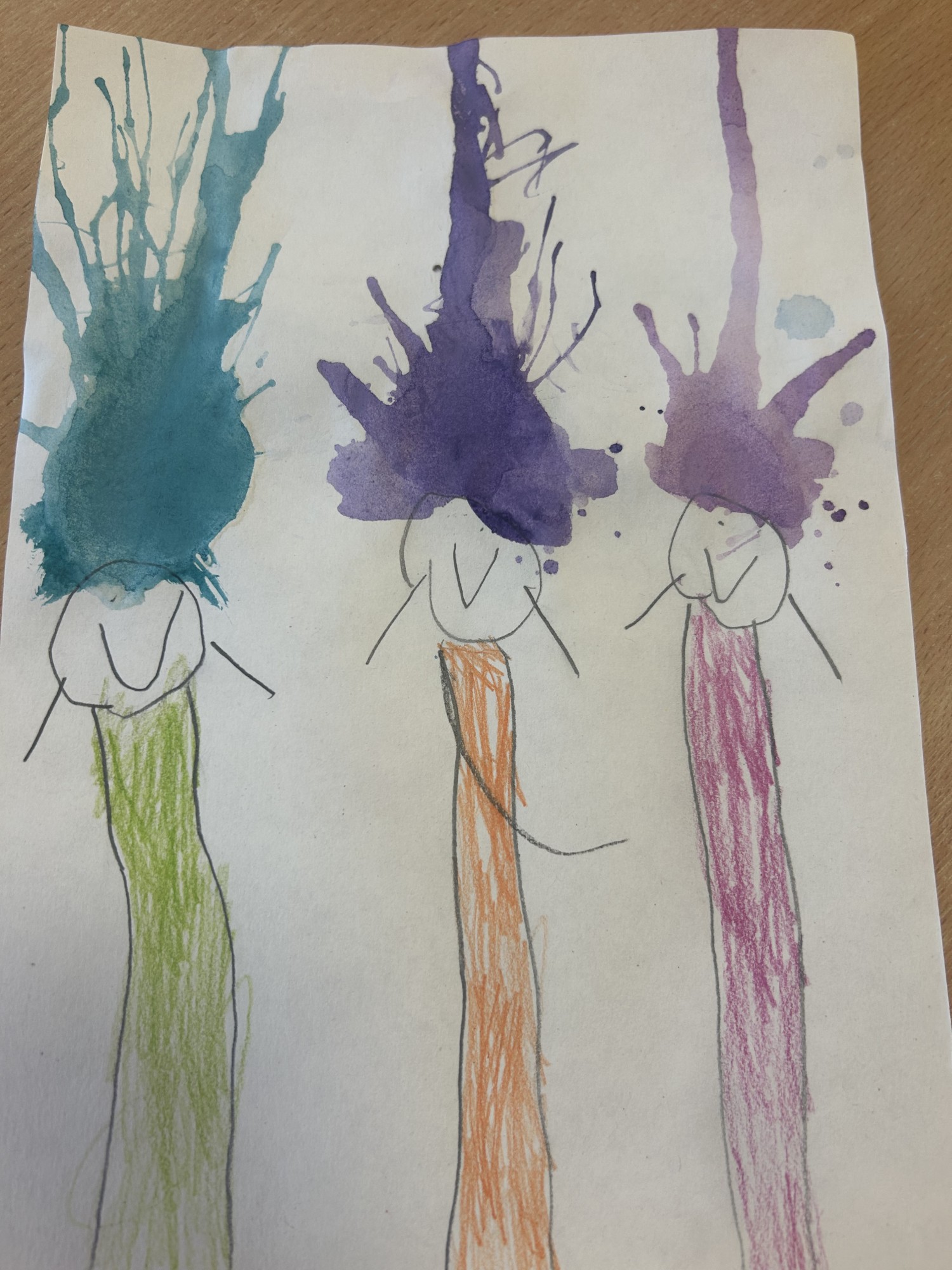 Izmantojot ūdeni un ūdens krāsas ( akvareļu krāsas) izpūtām ar salmiņu saviem zīmētiem cilvēciņiem matus.