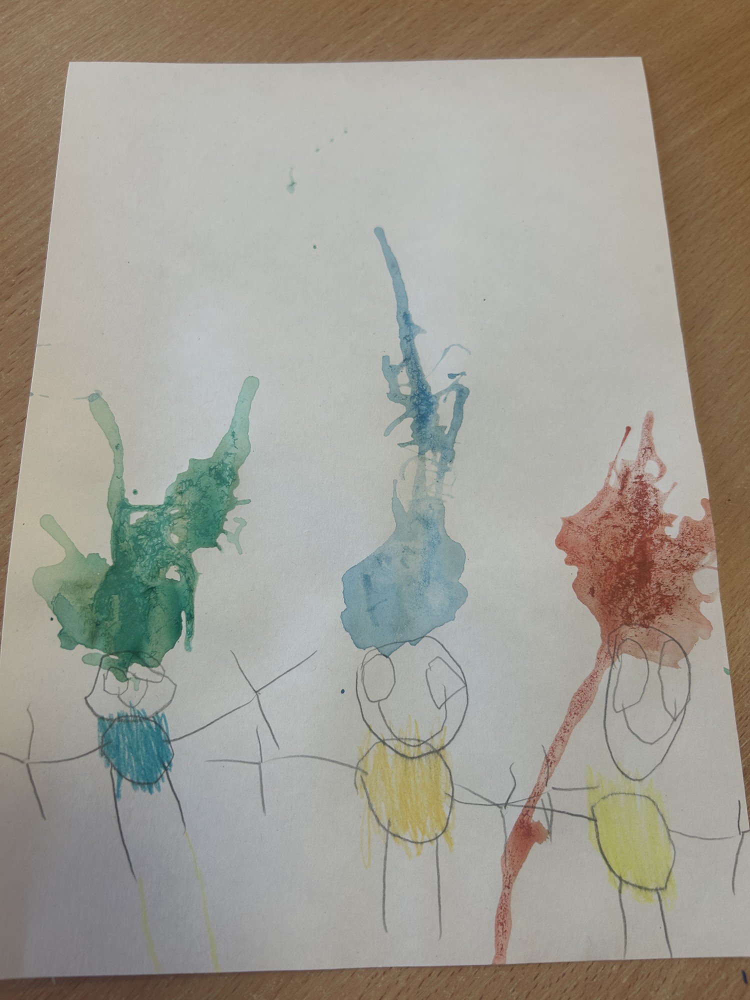 Izmantojot ūdeni un ūdens krāsas ( akvareļu krāsas) izpūtām ar salmiņu saviem zīmētiem cilvēciņiem matus.