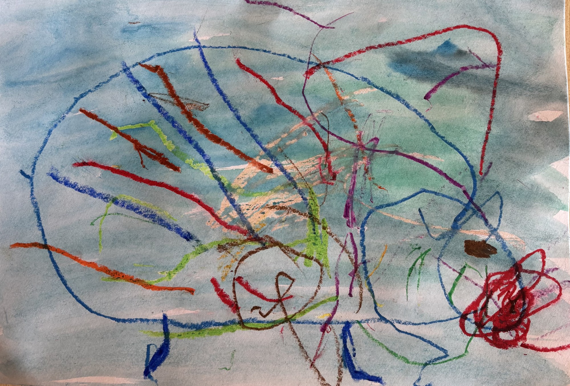 Vaboles patīk tīrs ūdens. Zīmējums zīmēts ar vaska krītiņiem un akvareļu krāsām.