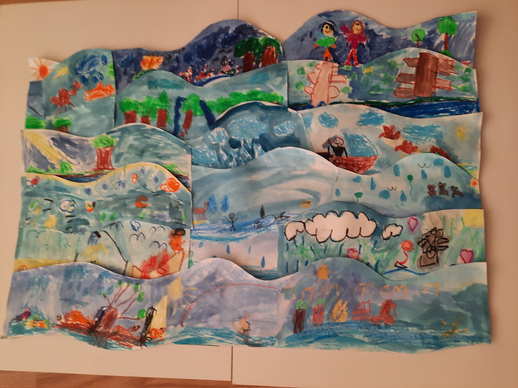 Katrs bērns zīmēja savu vilnīti, un salīmējām mūsu jautros ūdens vilnīšus vienā lielā jūrā.