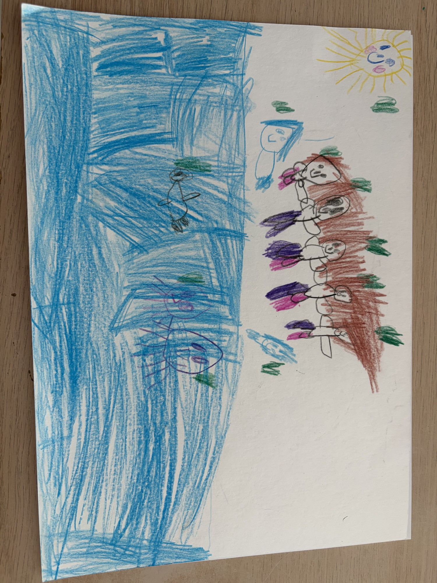 Zīmējumā attēlota gan ūdens pasaule ar zivīm un citiem ūdens iemītniekiem, kā arī cilvēkiem, kuri priecājās par to, ka ūdens mums dod dzīvību.