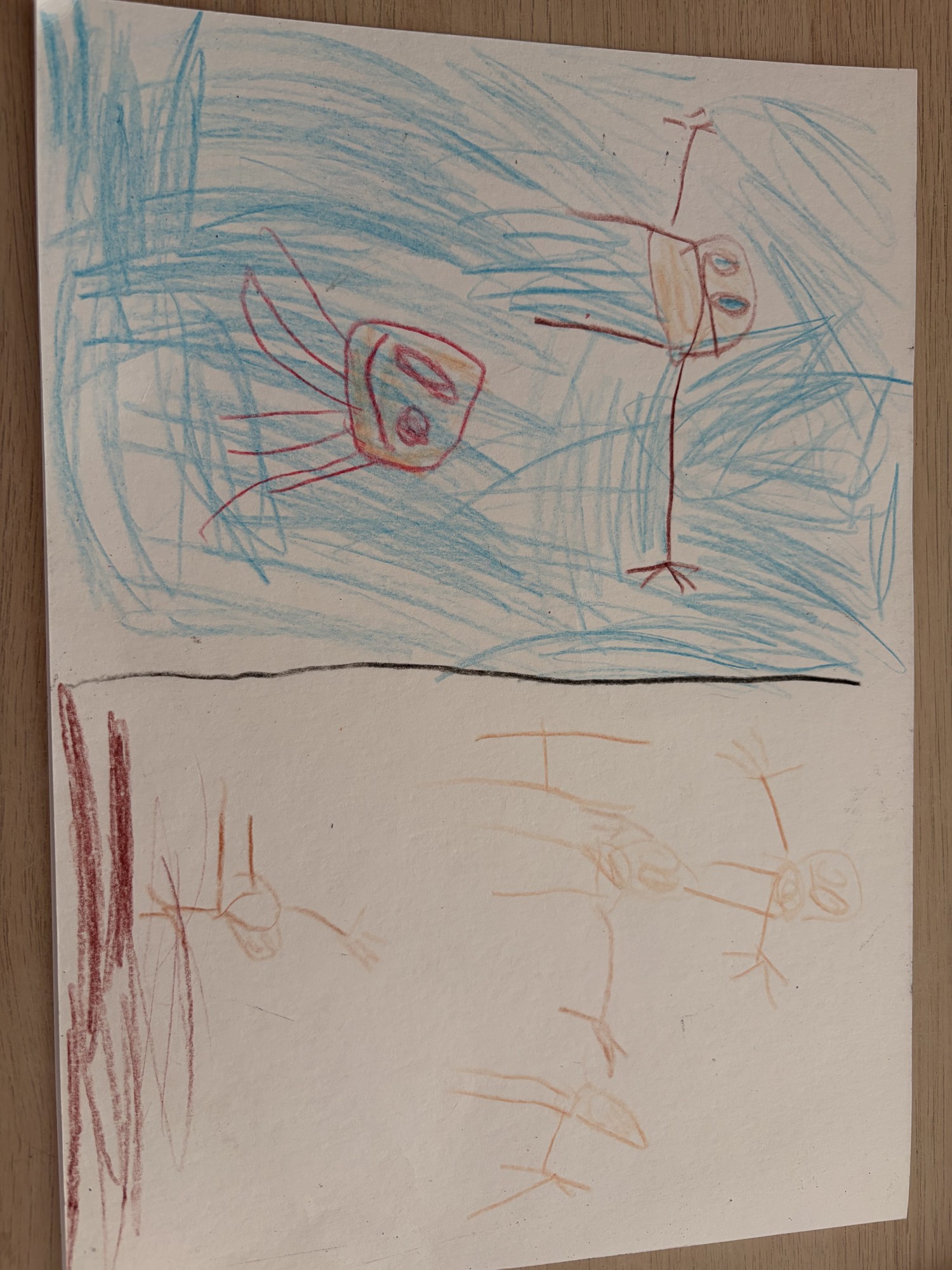 Zīmējumā attēlotas divas puses, vienā- priecīgs cilvēks un astoņkājis, jo tie dzīvo pasaulē, kurā ir ūdens, otrā bēdīgi, satraukti cilvēki un dzīvnieki, jo viņiem trūkst ūdens lai tie izdzīvotu.