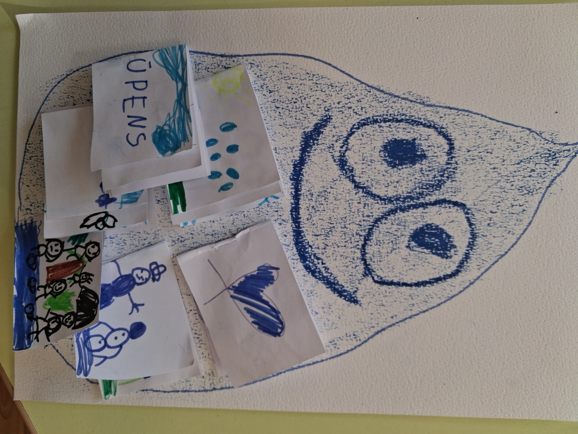 Zīmējumā redzama ūdens lāsīte, kurā saliktas bērna domas par to, kāda ir ūdens nozīme.