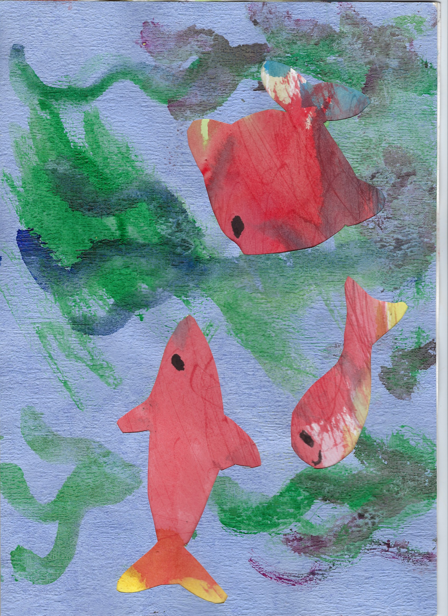 Autors - bērns ar īpašām vajadzībām. Bērns krāsoja lapu un pēc tam uzlīmēja iepriekš pēc trafareta izgrieztas zivtiņas, veidojot ūdens vidi.