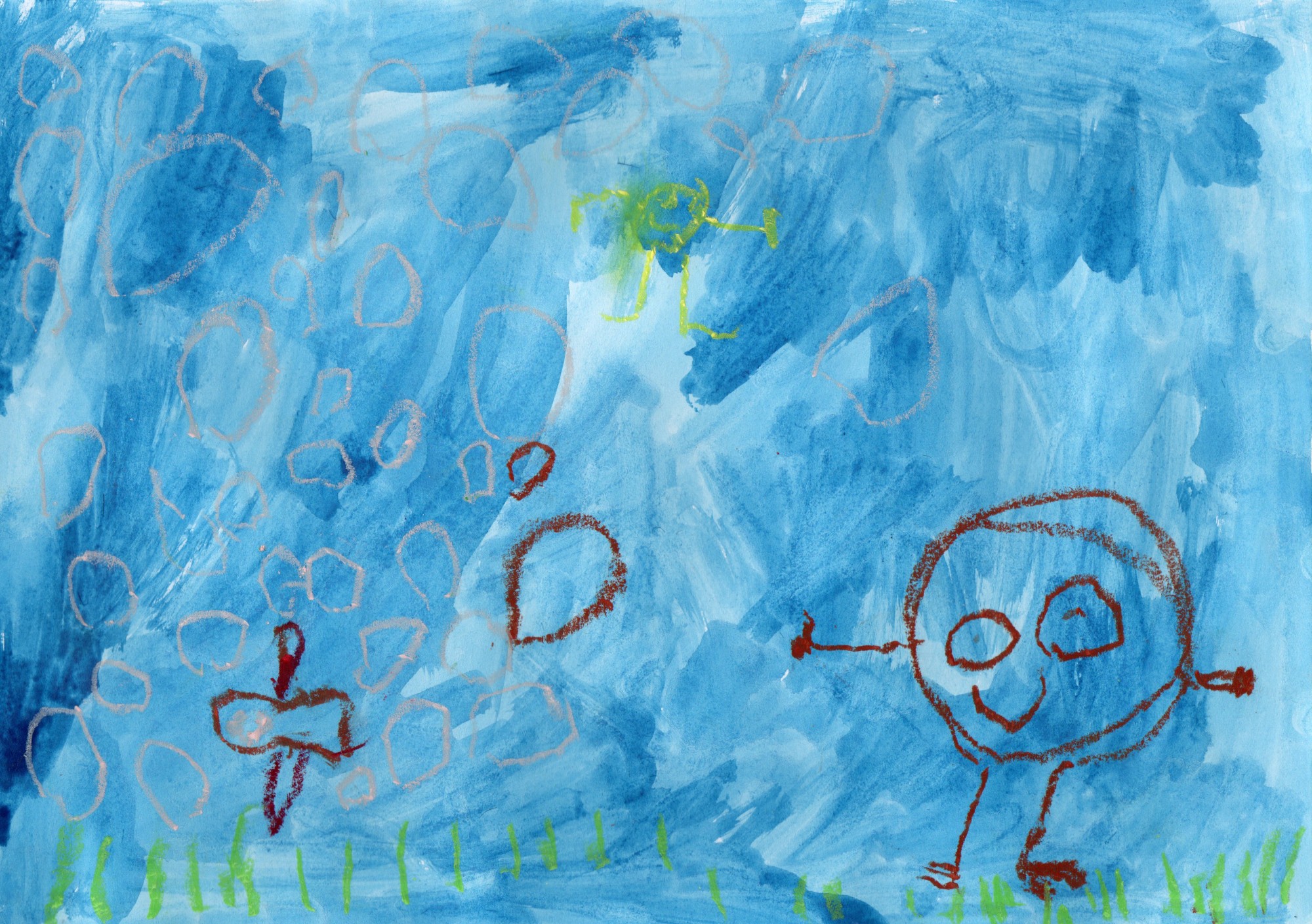 Burbuļu bērni spēlējas un burbuļo. Burbuļi saka: "Buļ, buļ!" Ūdenī aug zāles un peld zivs.