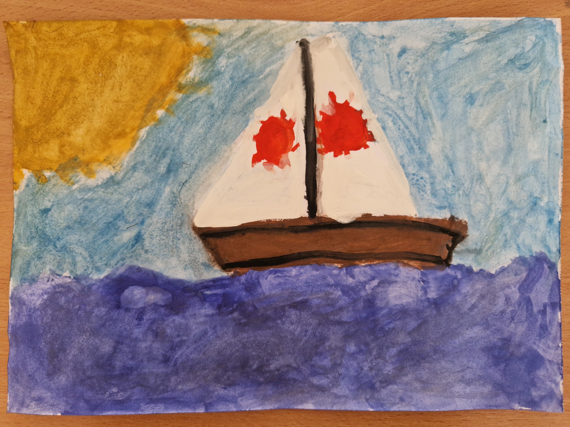 Glezna attēlo mazu buru laivu, kas peld zilā jūrā saulainā dienā. Debesīs spīd liela dzeltena saule, bet laivas baltajās burās redzami sarkani rotājumi. Darbs rada mierīgu un vasarīgu noskaņu, it kā laiva dotos skaistā piedzīvojumā pa jūru.