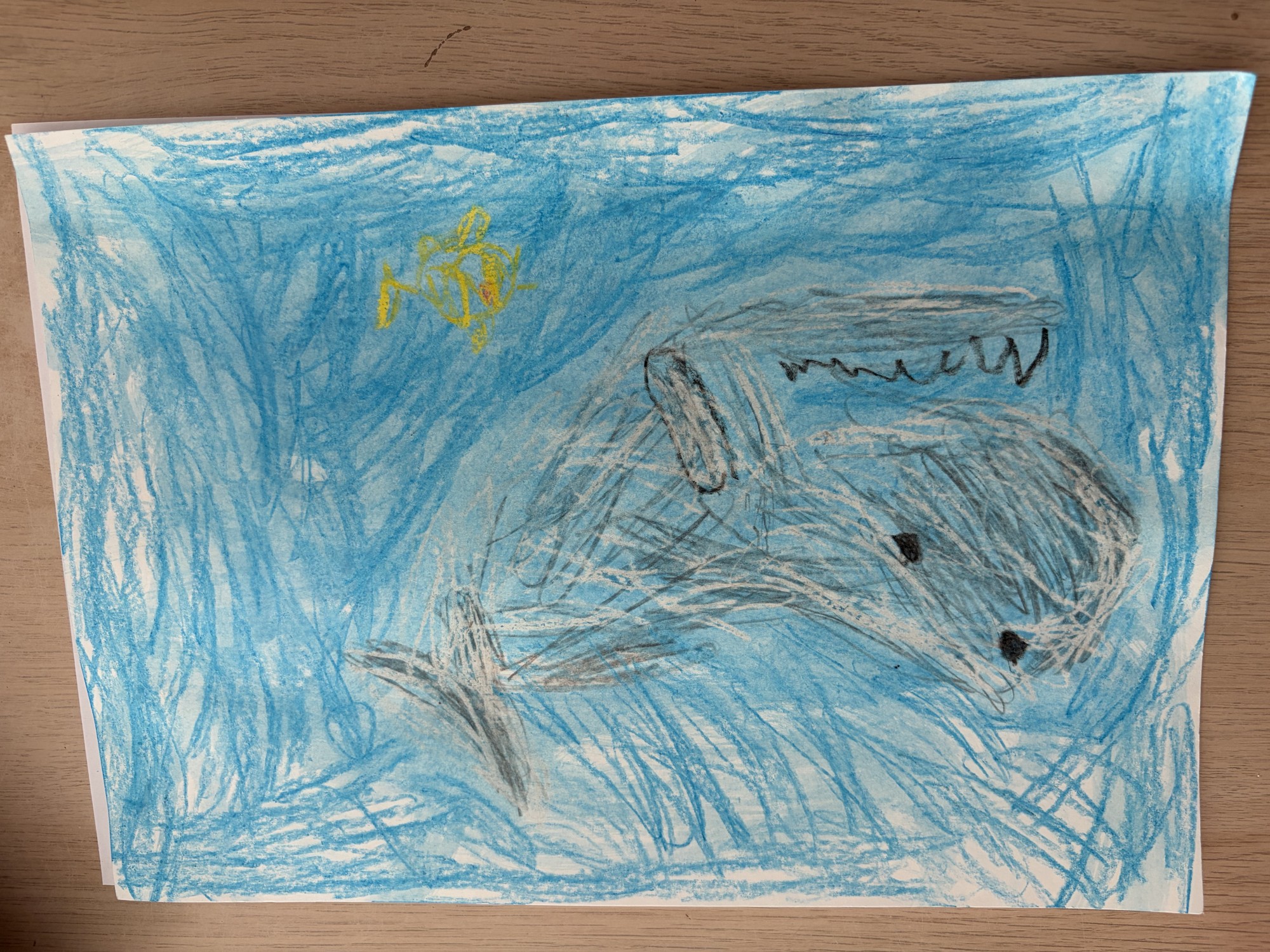 Zīmējumā attēlota haizivs un zivs, kas simbolizē to, ka ūdens pasaulē vieta ir gan lieliem, gan maziem.