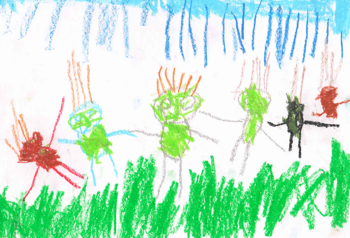 Es ar savu ģimeni staigāju pa slapjo zāli pēc lietus.
