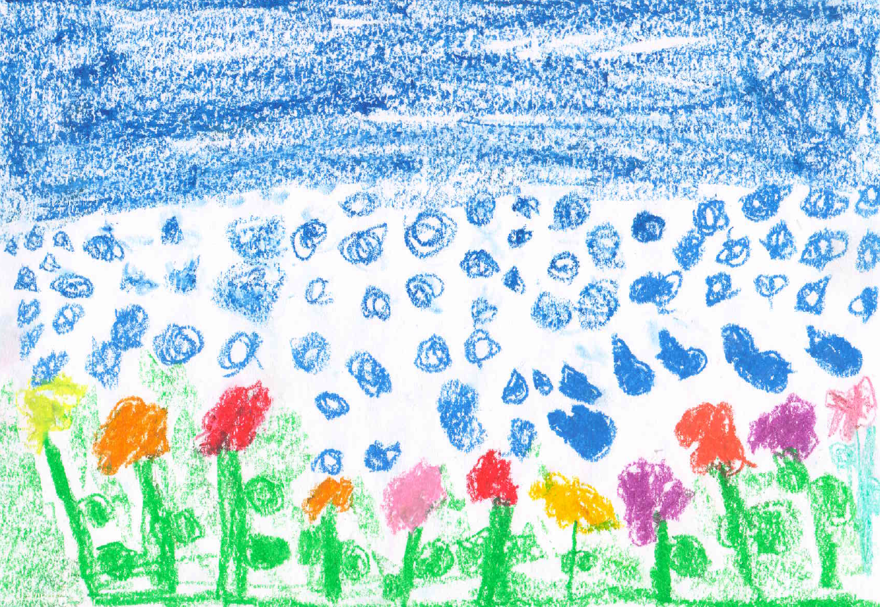 Es uzzīmēju puķes un kā līst lietus uz puķēm.