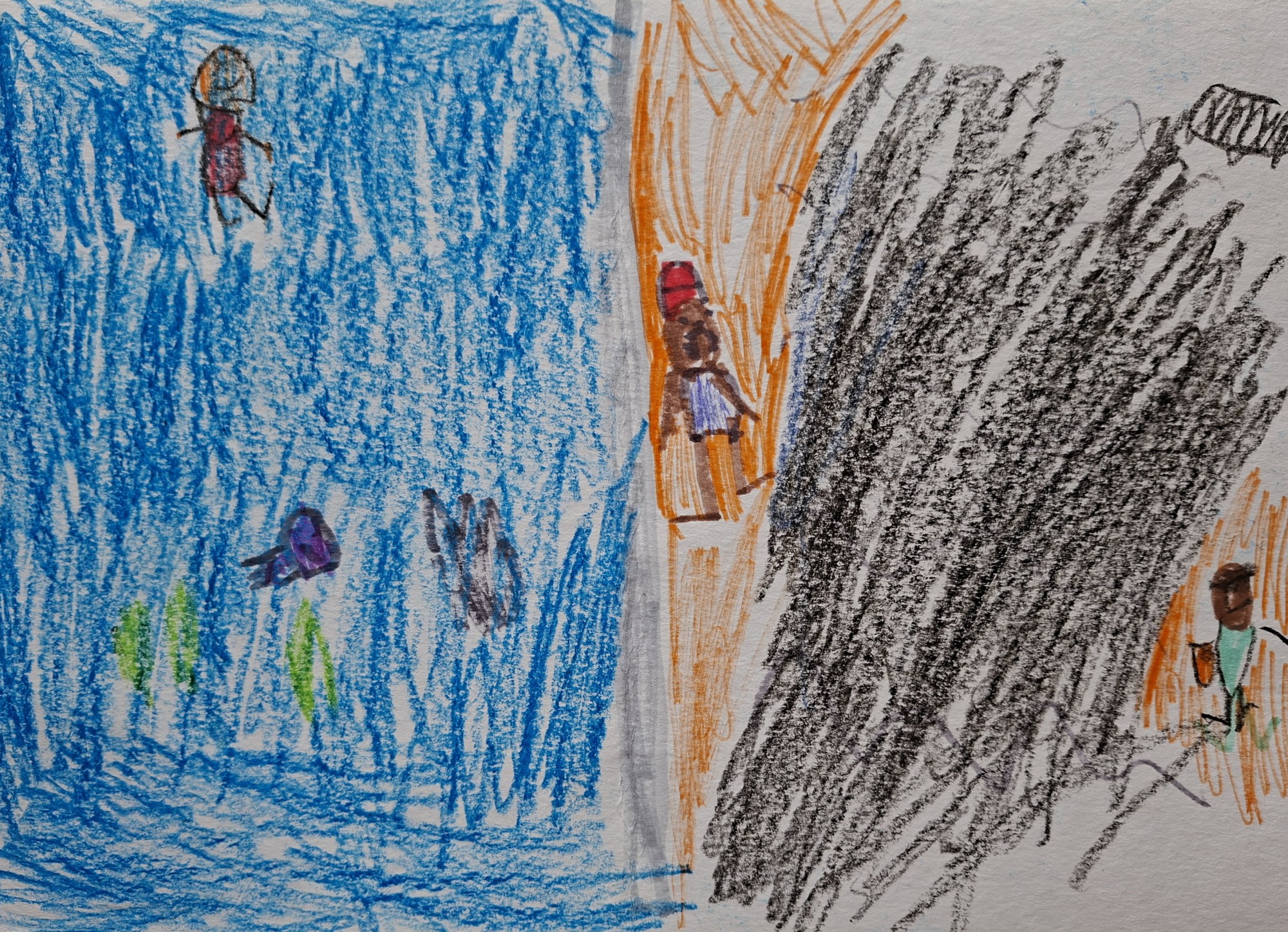 Lapas kreisā pusē-Zivis un cilvēki priecājas un peldas tīrā ūdenī. Lapas labā pusē- Kad ūdens ir piesārņots un netīrs, tad visi ir bēdīgi.
