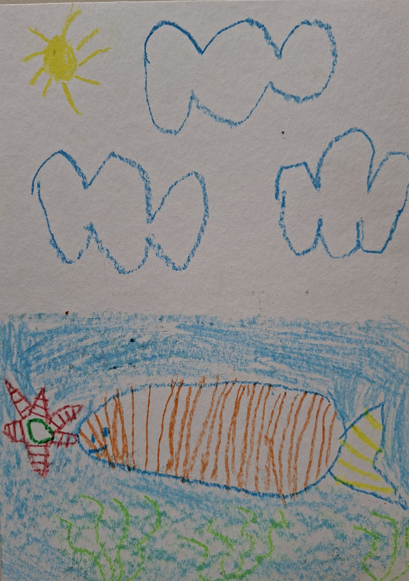 Priecīga zivtiņa un jūras zvaigzne peld ūdenī.