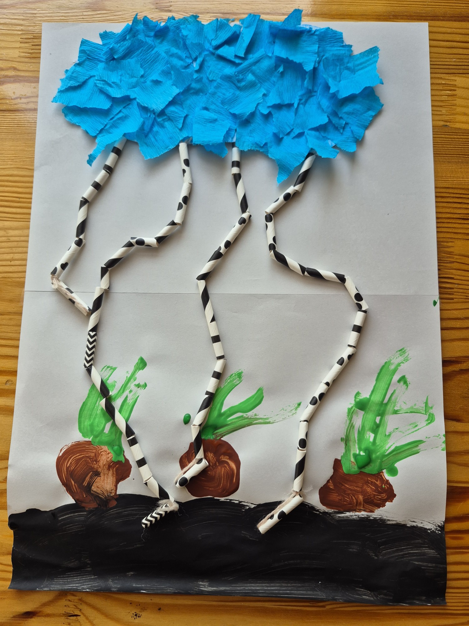 Šajā darbā attēlots lietus, kas līst no mākoņiem un palīdz augiem augt. No zemes aug sīpoli ar zaļiem asniem, kuriem ūdens ir ļoti nepieciešams. Ūdens ir dzīvības pamats – tas palīdz augiem augt, dabai zelt un visai pasaulei dzīvot.