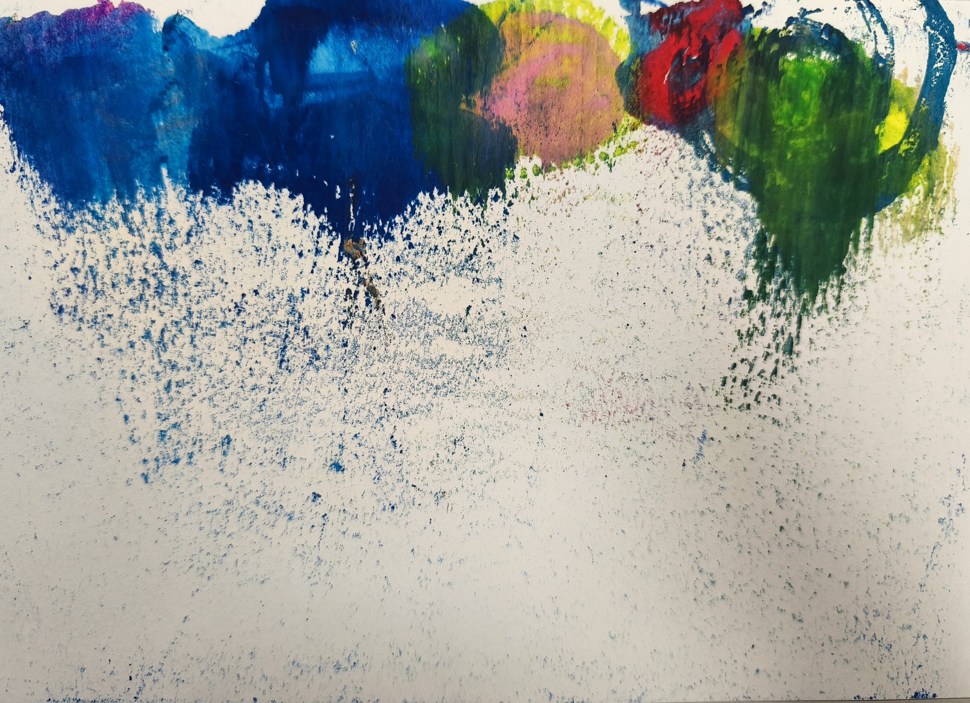 Darbs veidots uz karsta gludekļa krāsojot ar vaska un pasteļkrītiņiem, tad uzgludinot, uzpludinot uz lapas.