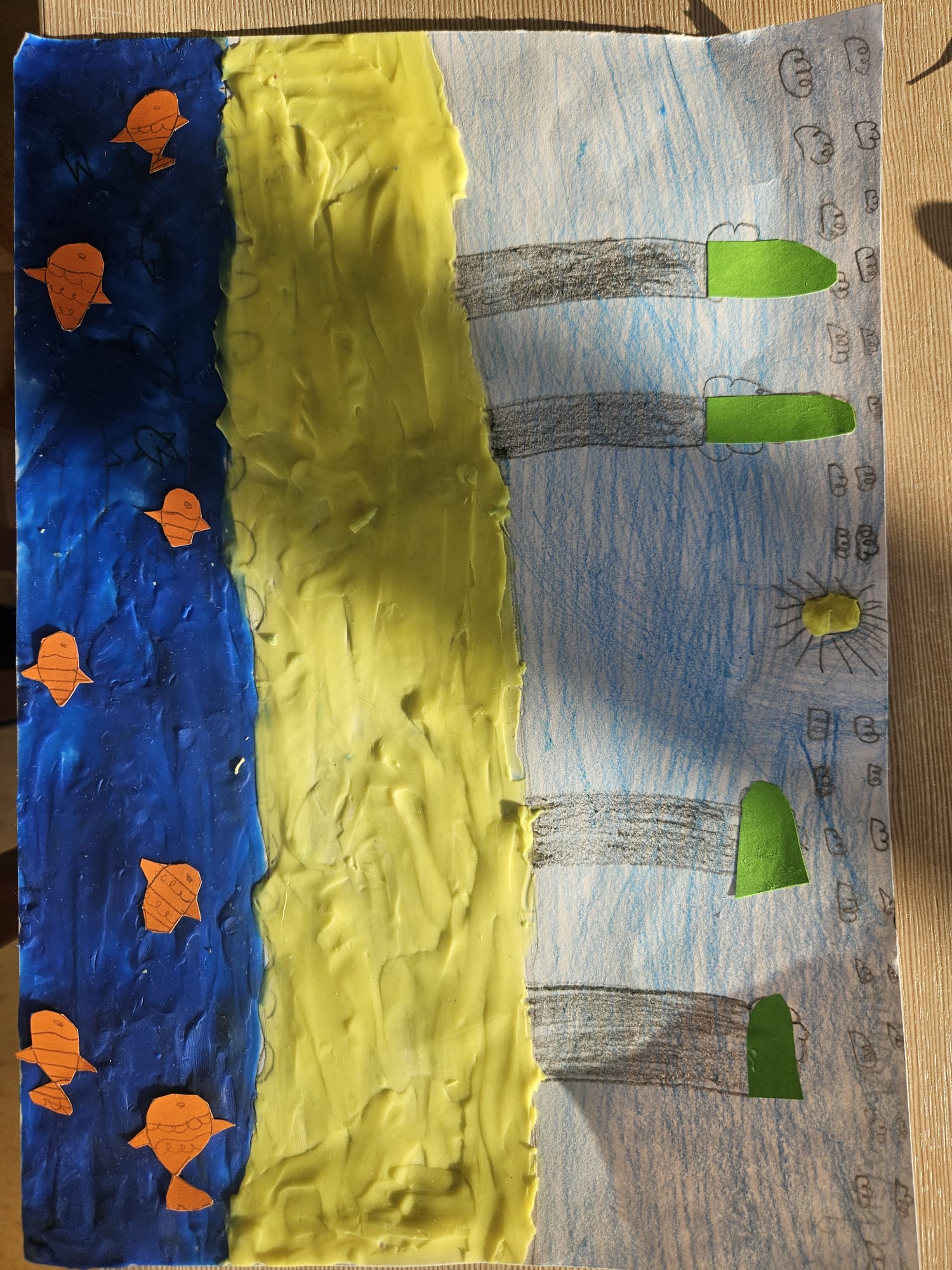 "Manā zīmējumā redzama upe ar zivīm un zeme virs tās. Tur plūst ūdens, kas palīdz dabai un dzīvniekiem dzīvot. Zivīm ir vajadzīgs tīrs ūdens, lai tās varētu dzīvot drošā vidē. Ar šo zīmējumu es gribēju parādīt, ka ūdens ir ļoti svarīgs un mums tas jāsaudzē."