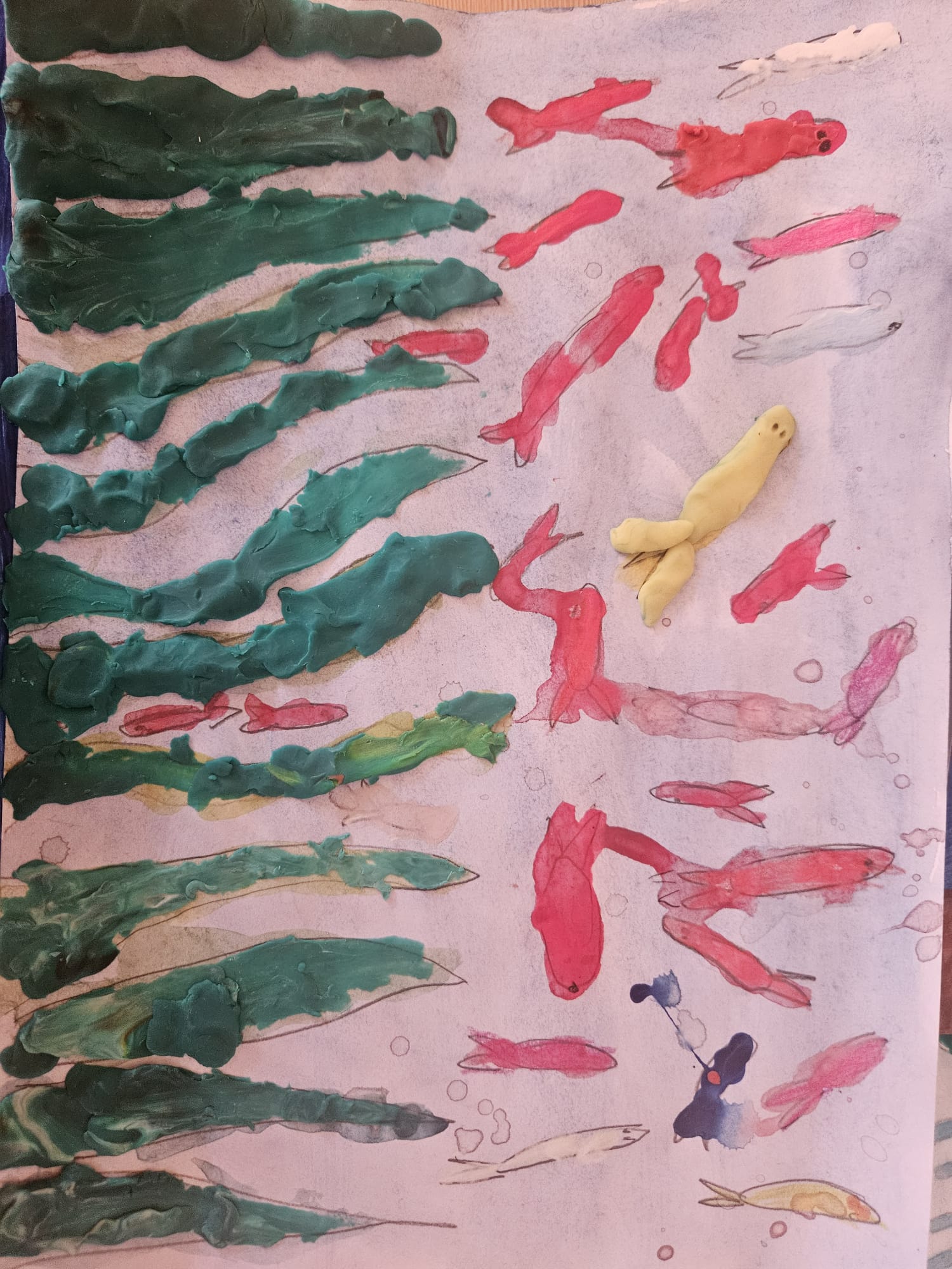 "Es uzzīmēju ezeru, jo ūdens ir ļoti svarīgs. Ezerā dzīvo daudz zivtiņu, un es tās visas izkrāsoju, lai parādītu, cik dažādas tās ir. Dažas zivtiņas es pielīmēju, lai izskatās, ka tās peld tuvāk. Zaļās zāles es pieliku tāpēc, ka bez ūdens tās nevarētu augt. Man patīk, ka ezerā viss kustas un dzīvo, jo ūdens dod dzīvību gan augiem, gan dzīvniekiem."