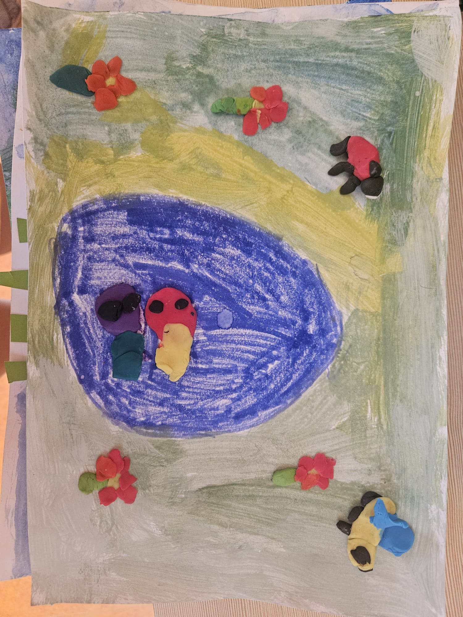 "Es uztaisīju dīķi pļavā, jo ūdens ir ļoti svarīgs. Dīķī dzīvo manas mazās zivtiņas, un bez ūdens viņas nevarētu dzīvot. Apkārt dīķim es pieliku puķes, jo tās aug tikai tad, ja ir ūdens. Man patīk, ka dīķis ir kā mājas visiem gan dzīvniekiem, gan augiem. Ūdens padara pļavu dzīvu un krāsainu."